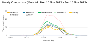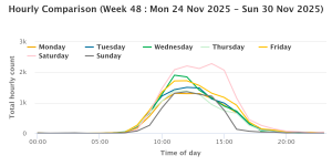 Table showing which days of the week had the highest average daily footfall between 1st January 2025 and 30th November 2025.