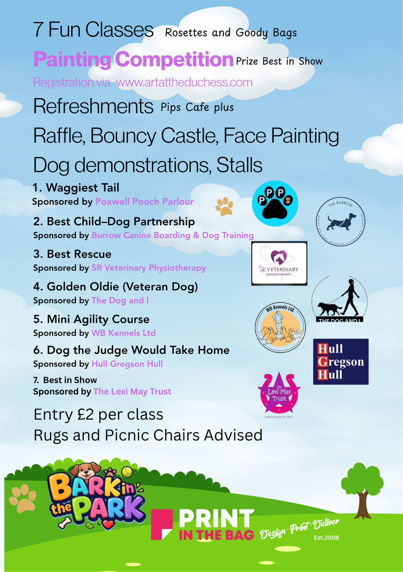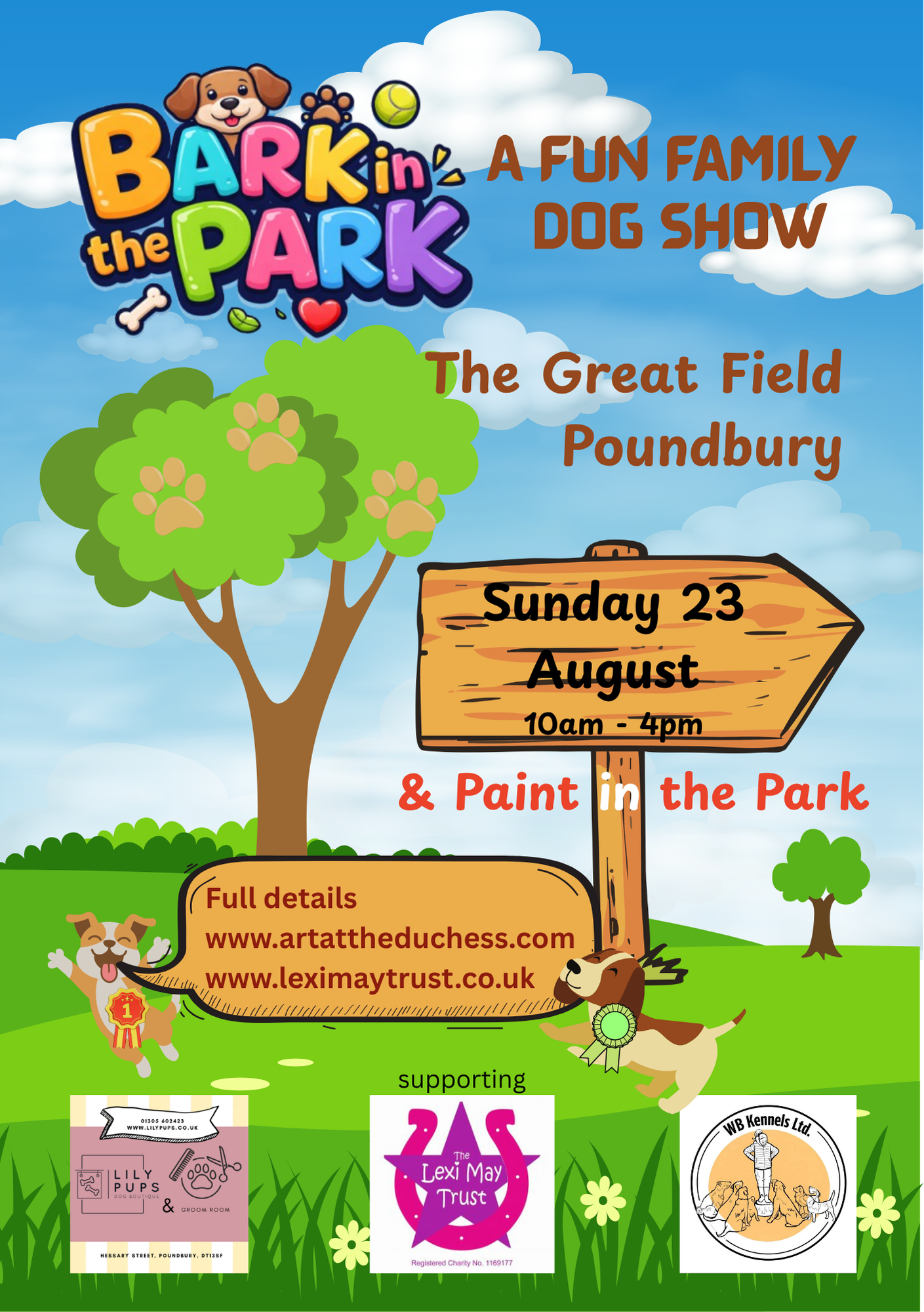 A Family Fun Dog Show on the Great Field in Poundbury supporting The Lexi May Trust. 6 fun dog show classes with rosettes and doggy bag treats for winners. Market stalls; Refreshments; Bouncy Castle; Face Painting; Demonstrations ; Paint in the Park competition; and more!