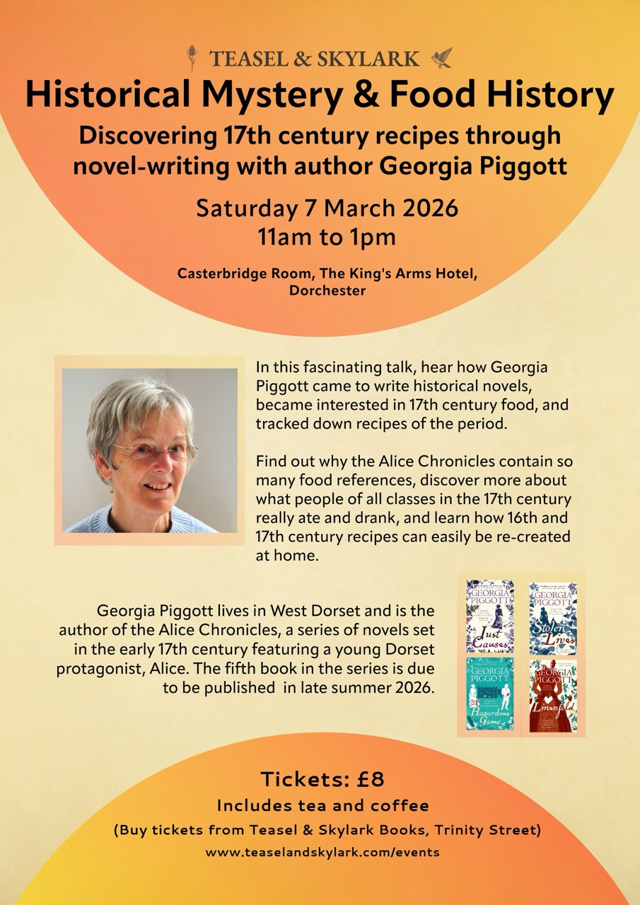 Georgia Piggott lives in West Dorset and is the author of the Alice Chronicles, a series of novels set in the early 17th century featuring a young Dorset protagonist, Alice. The fifth book in the series is due to be published in late summer 2026.