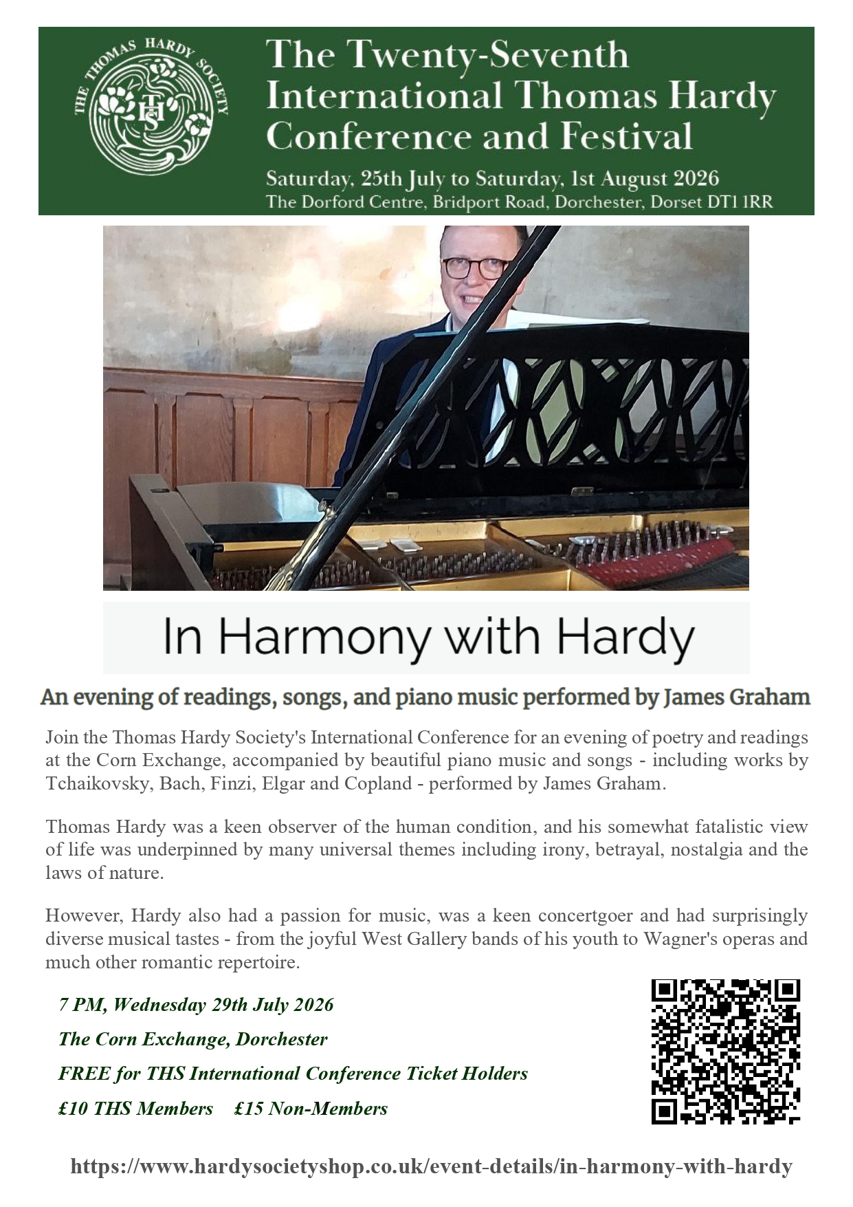 Dr Natalie Buton is the Literary Curator. THS Chair Mark Damon Chutter will be the narrator for the evening, and the accompanist for the songs will be Clara Pears. Alban O’Brien and Giles Keating will be reading from the works of Hardy.