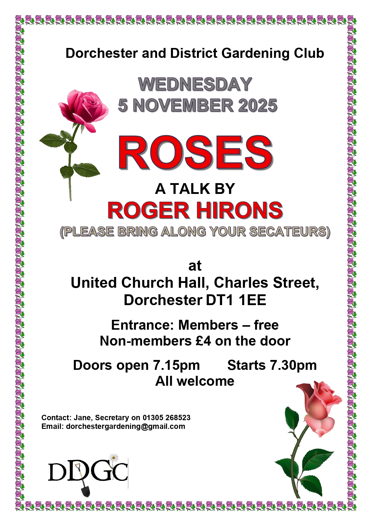 Roses is the subject of a talk by Roger Hirons (The Plant Doctor) at the next monthly meeting of Dorchester and District Gardening Club. Roger Hirons has forty years experience in the plant industry and has presented plants to the public regularly since 1992. The talk on Roses is a hugely important subject that goes much deeper than the Rose that the British people love. Learn the dos and don’ts to enhance your garden performance for many seasons to come.