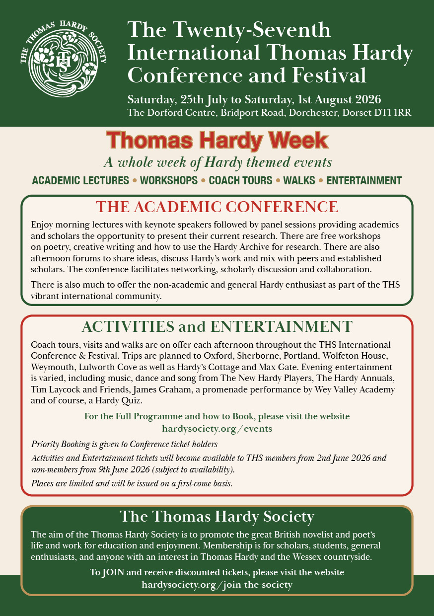 The 27th festival runs from Saturday, 25th July to 1st August 2026 and includes academic lectures, literary tours of Hardy’s Wessex, entertaining performances and social events. Everyone is welcome.